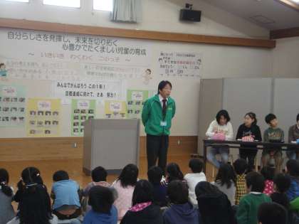3月9日 今日の6校時に後期児童総会を行いました。総務委員会の挨拶から始まり,各委員会・縦割りの各色班・各学級と後期のまとめが報告されました。各報告を聞いた子どもたちは,意見なり感想を手を挙げて発表していました。来年は今の4年生と五年生がみんなをリードしてくれます。今日の総会の話し合いを生かしてさらにいい学校をめざして頑張ってほしいと思います。