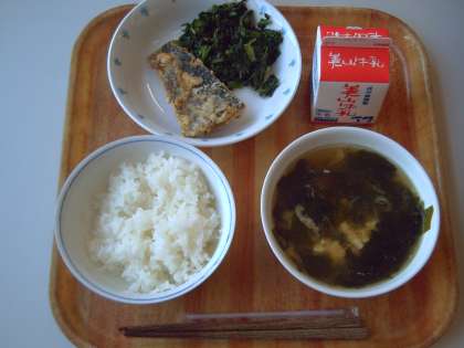 今日の献立は,ごはん・牛乳・さわらのたつたあげ・ほうれん草のおかか煮・みそ汁でした。今日のみそ汁は,油あげとわかめとみょうがでした。みょうがは給食で初めて出る食材でした。独特のよい香りとシャキシャキの歯ごたえで、子ども達はよく食べてくれました。これからの季節によく合う食材です。