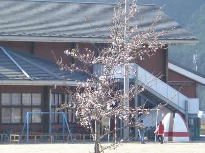 4月12日 朝から暖かな日差しが降り注ぐ中,子どもたちが登校してきました。校庭の桜も咲き始め,三分咲きぐらいになりました。周りの山々の緑の中に山桜やこぶしの白い色が増えてきました。
