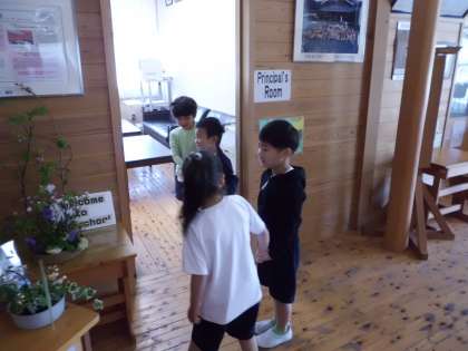 生活科の学習で,学校探検をしました。1年生の時は案内をしてもらった側でしたが,今年は,1年生をリードして案内している2年生の姿が見られました。1年生の質問に対しても,答える様子が見られました。学校探検の後,学校すごろくをしました。そこで,2年生が1年生に学校行事や学校のことについてお話をしました。