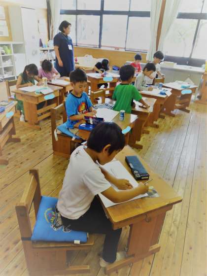 算数科「いろいろな かたち」の学習で,1年生のみんなが持ってきた箱や缶などの形を写しとって絵を描きました。最初は取り合えず形を写しとっていっていましたが,だんだんとさまざまな形に見えてきた様子で,どんどん色をつけていっていました。