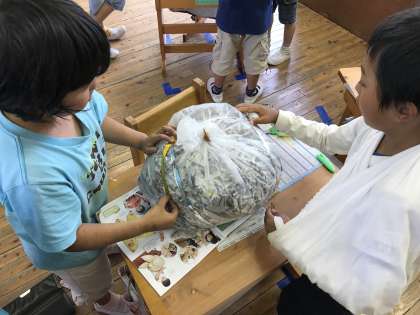 図工の授業で,細かくちぎった紙を袋に詰めてねじったり,しばったりして形を変えて,それぞれの作品を作る学習をしました。児童たちは3人1組で協力して,それぞれオリジナルのキャラクターを作り上げました。