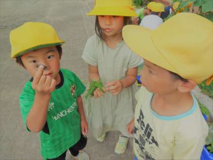生活科の学習で育てているあさがおがすくすくと育っています。肥料と水やりをして,みんなで協力して畑の草抜きをしました。草抜きをしていると,育てているひまわりが自分の背より高くなっていることや,ばった,みのむしなどたくさんの生き物がいることに気がつきました。たくさんの発見があって,みんな楽しそうな様子でした。