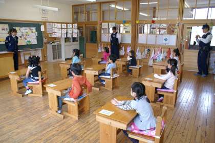 1年生の交通安全教室が開かれました。山国と黒田の駐在所のお巡りさんから教室で楽しく安全について学習しました。また外に出て、横断歩道の渡り方,見通しの悪いところでの横断の仕方など実際に歩きながら学習しました。