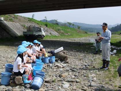 5月9日(月)に中江橋で4年生が鮎の放流をしました。バケツに鮎の稚魚を一人ずつ入れてもらうと,早速,川に入り,子どもたちは嬉しそうに鮎を少しずつ放流しました。放流した後、上桂川漁業協同組合の方から、京北の自然豊かな上桂川で放流した鮎が大きく生長してほしいとみんなにお話をして頂きました。