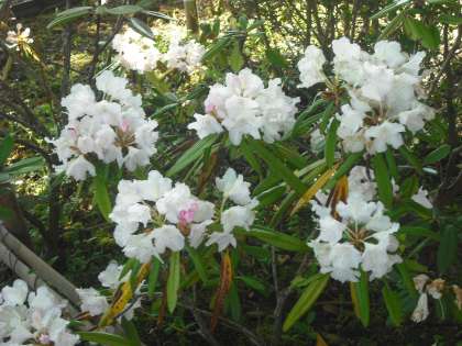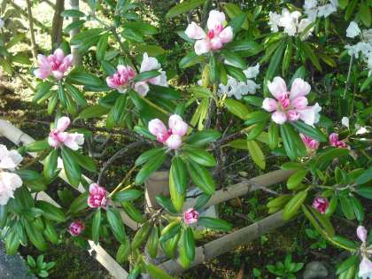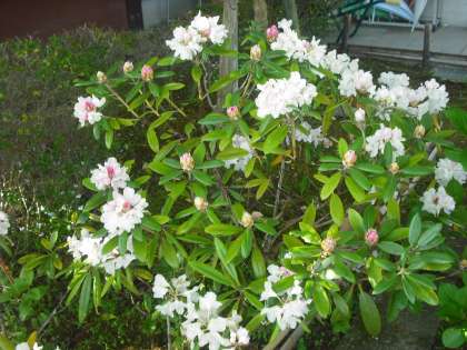 5月18日 玄関横のシャクナゲが今年も綺麗に咲き出しました。白やピンクの可憐な花をいっぱい付けています。朝夕まだ10度前後と冷え込む日がある京北。春の花がようやく咲きそろいました。