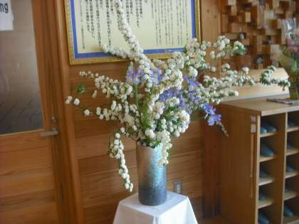 5月20日 今週の花コダマリを玄関に花瓶に挿してあります。ハナショウブも添えて来校する人を玄関で迎えています京北第二小では年間を通してその時期の花を飾っています。桜・ススキ・ユリ・桃・・ユキヤナギ・梅・ろうばい・ネコヤナギなどのその季節を感じるものをいろいろ生け,子ども達に季節感を育てようと思います。
