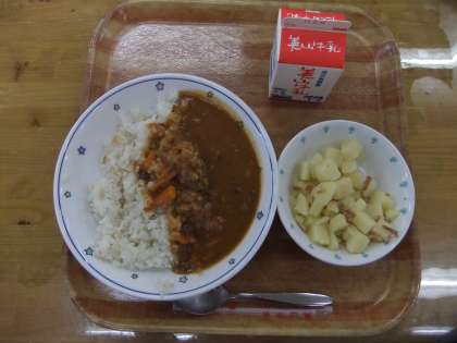 今日の献立は,麦ごはん・牛乳・ハッシュドビーフ・ジャーマンポテトでした。ハッシュドビーフは,手作りのルーはとろりとなめらかで,トマトの酸味もありとてもおいしかったです。ジャーマンポテトは,ベーコンのうま味がじゃがいもとよく合っていておいしかったです。子どもたちも,もりもりといただきました。