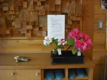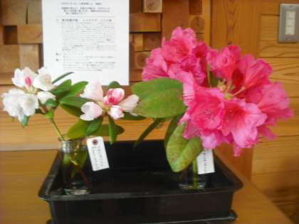 5月24日 今朝の京北は,11度と肌寒い朝です。朝早く地域の方からシャクナゲが届きました。毎週いろいろな花を届けていただいております。今週は,シャクナゲを2種類届けていただきました。ホンシャクナゲ(ニホンシャクナゲ)は白色で少し小さな花です。セイヨウシャクナゲは,日本のものが品種改良されたもので大きい赤色です。季節感があって,美しいものです。