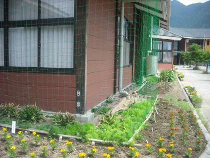 6月9日 ようやくネットも張れ,緑のカーテンの準備ができました。今年もヘブンリーブルーやオーシャンブルーの西洋アサガオやスカーレットオハラのような真っ赤なアサガオも植えました。毎年11月いっぱいまで子ども達や地域の皆さんを楽しませてくれます。