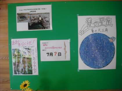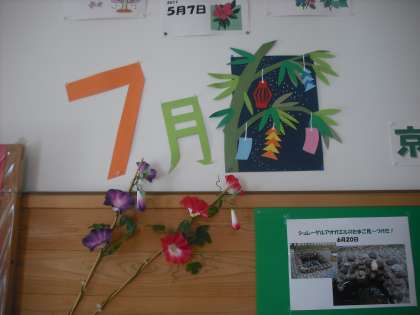 7月5日 花暦の掲示コーナーが7月バージョンになりました。夏の星座紹介・昆虫紹介など夏らしくなっています。今月の花は,アサガオとひまわりです。
