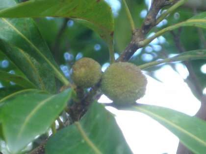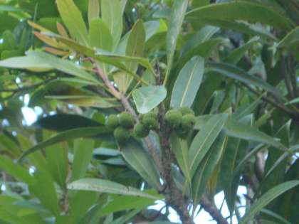 7月8日 また今年もヤマモモの木にたくさんの実がつきだしました。実は夏に赤く熟し,甘酸っぱい味がします。まだ子ども達は知りません。夏までに気づくかな?