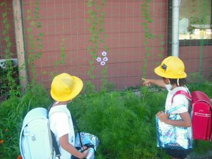 7月11日 朝からまぶしい太陽が緑のカーテンに降り注いでいます。今日も新しいアサガオの花が咲いています。つぼみもいっぱい出来ています。これからどんどん咲きそうです。30度を超える暑さの中で涼しげに咲いているアサガオを見るとほっとします。