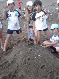 大磯浜で「砂の造形遊び」です。みんな芸術家です。