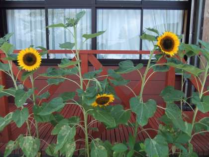 8月4日 1年生の花壇には,ひまわりと枝豆が育っています。特にひまわりは大輪を付けています。