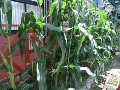 8月4日 2年生の花壇には,たくさんのトウモロコシが育っています。しっかりネットでアライグマ対策もとってあります。