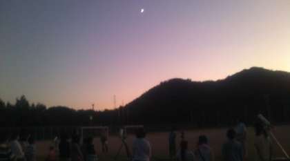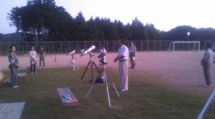 8月4日 今夜は最高の夜空となりました。午後7時から周山中学校のグラウンドで中学校主催の「天体観望会」が開催されました。40人余りの子ども達と保護者が集まりました。中学校の先生の説明でいろいろな星のことがわかりました。特に土星・北斗七星・北極星など普段耳にする星についてはみんな興味津津で聞いていました。
