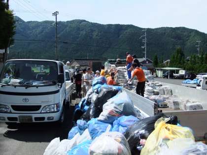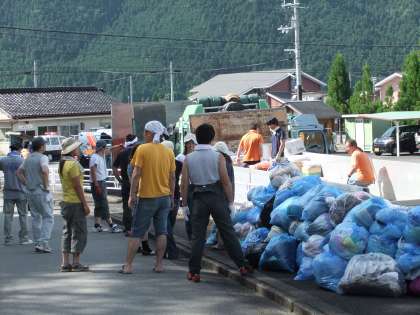 8月7日 朝早くから京北第二小学校の地域で廃品回収がありました。各自治会・地域各種団体・PTAOB・保護者・教職員が参加され,地域挙げての廃品回収でした。午前中には作業が終わり,大きな15トン車・パッカー車2台・軽トラックが新聞紙・段ボール・雑誌・古着を満載して帰りました。地域の「力(パワー)」を感じました。