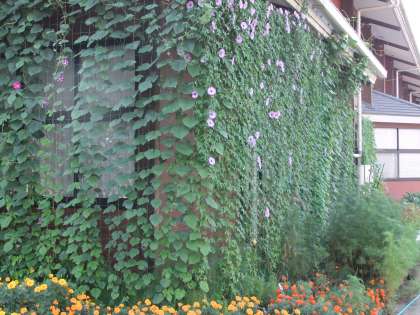 8月12日 緑のカーテンのアサガオが一気に咲き出しました。今,100以上の花を付けています。紫・ピンク・ブルーがとても綺麗です。
