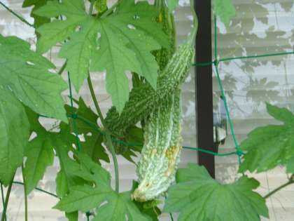 8月18日 緑のカーテンを作っているツルレイシも大きくなって種とり用のものは黄色く色づいてきました。来年のためにいっぱい種を取りたいと思います。