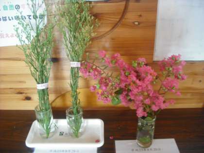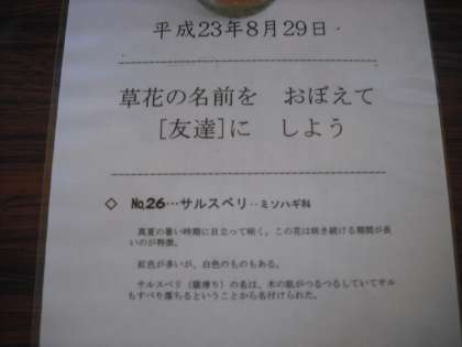 8月29日 今朝も7時過ぎに地域の方から草花をいただきました。4月から毎週のように身近な草花を2種類ずつ届けていただいています。今週は,さるすべりの花など2種類を届けていただきました。必ず名前もカードに書いていただいています。「京北の子ども達が一人でも多く自然に親しんでくれたら」という言葉を残し,帰られました。本当のありがとうございます。