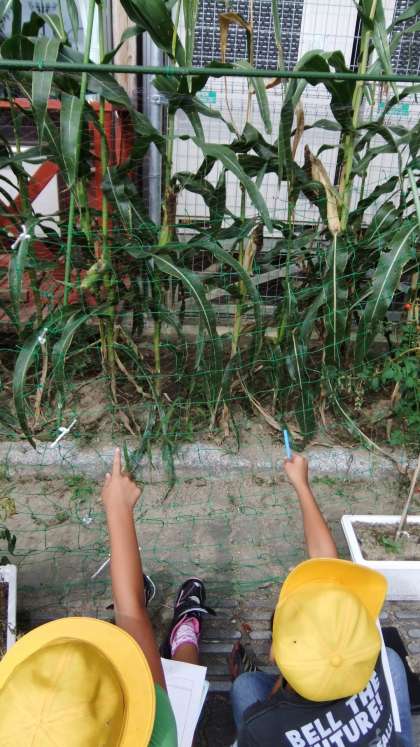 トウモロコシを観察後、収穫し、教室の後ろに干しました。