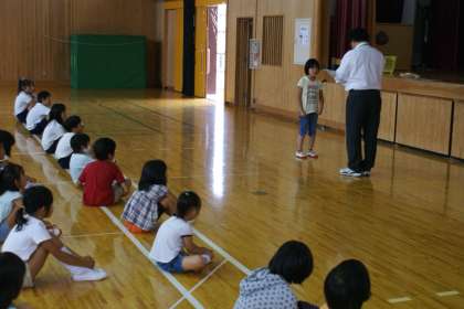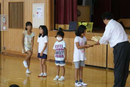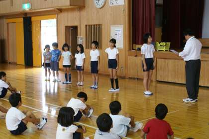 今日の朝会で「京都市小学校児童硬筆作品展」「京都市小学校絵画展」の表彰と京北まつりの灯籠の絵の優秀賞のご褒美が伝達されました。みんながんばりました。