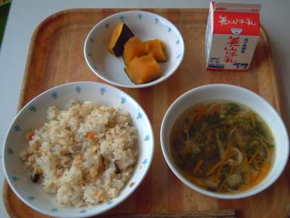 今日の献立は,こぎつねちらし・牛乳・かぼちゃの煮つけ・七夕そうめんでした。こぎつねちらしは,油あげとにんじん,しいたけ,ごまと少しみょうがが入っていて,さっぱりとした味つけでおいしくいただきました。天の川にみたてた七夕そうめんで,七夕の気分を味わいました。