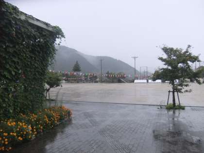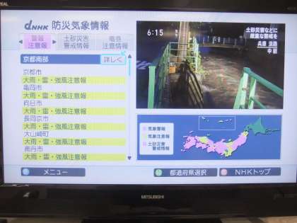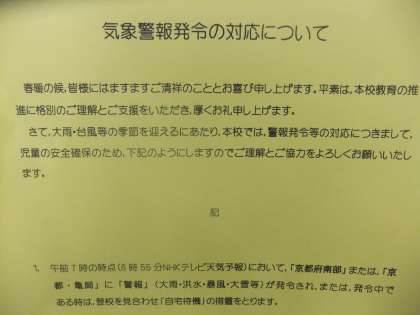 9月20日 午後6時現在,警報が注意報に変わっていますが,明日の昼頃に京都南部(午後6時現在のニュースでは)に一番近づくそうです。今後の天気情報をしっかり見聞きしていてください。また,ご家庭に張ってある「気象警報発令の対応について」を再度お読みください。