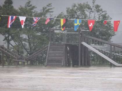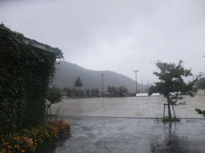 9月21日 学校の木々も揺れ始めてきました。運動会の時の万国旗がさらに下がってきています。台風が昼頃一番近畿に接近すると台風情報が伝えています。大雨・洪水・暴風警報が8時20分現在まだ続いています。