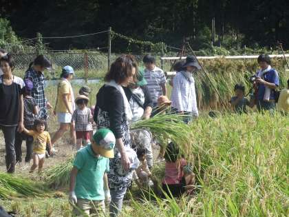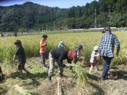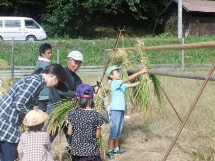 9月24日 今日は,土曜塾で京北第二小の子ども達がいもほりやパン作り・稲刈りを体験しました。くろやま塾の主催された土曜塾には,市内から120名ほどの子どもと保護者が参加されました。特に稲刈りには子どもも大人も初めて体験される方が多く,予定以上の稲穂を刈り取りました。そして,稲木に刈った稲穂を干しました。とても楽しそうにされていました。