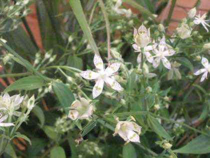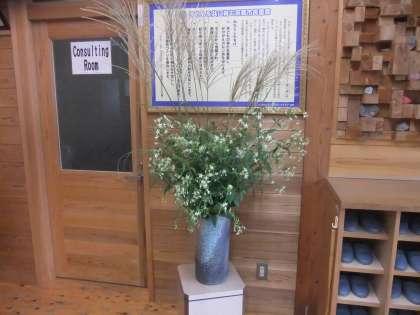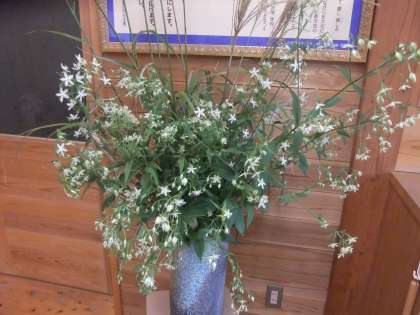 9月26日 先週ノ玄関の花は,ススキとチカラノシダでしたが,今週は,ススキとアケボノソウです。アケボノソウは,センブリ属で星形の開いた花びらに緑紫色の点々と黄緑色の丸い模様があります。この模様を明け方の星に見立てて名付けられているようです。