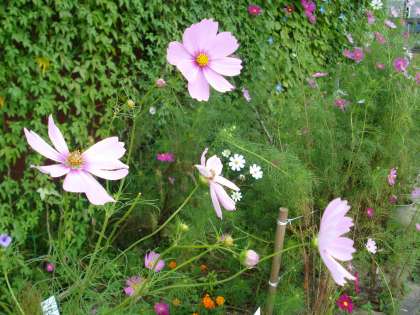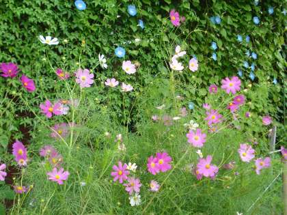 9月26日 学校園のコスモスが満開になりました。赤紫・白・ピンクなど大きい花を咲かせています。学校の中のあちこちに花瓶に入れて飾られています。