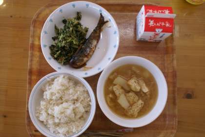 麦ごはん 牛乳 いわしのかわり煮 だいこん葉のごまいため みそ汁