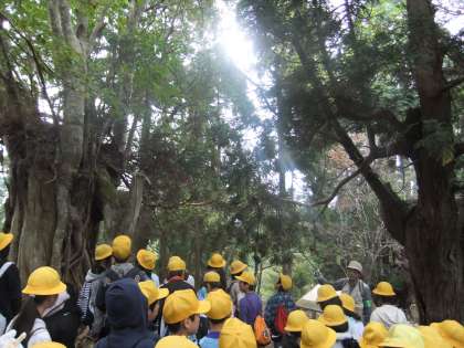 10月11日 今日は,6年生が片波川源流に1億数千年前の地層と群生する伏条台杉を見学に行きました。現地では,案内人の先生から説明を受けました。子ども達の中ではじめて見た子ども達は,京北地域の自然のすばらしさに驚いていました。