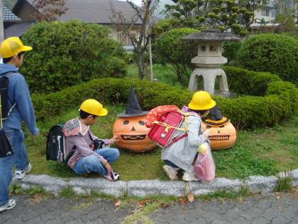10月12日 今朝の京北は霧も濃く,身も引き締まる気温です。今朝から玄関の庭にハロウインのカボチャが登場しました。登校してきた子ども達もびっくり!近づいて「おはよう!」と挨拶していました。