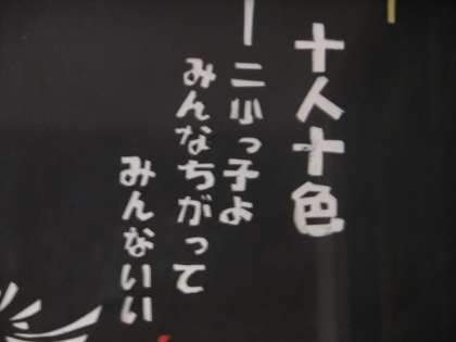 10月13日 後期が始まって3日目,子ども達や教職員も気分一新スタートを切っています。「十人十色,みんな違ってみんないい!」を合い言葉に一人一人の子どもを大切にしていきたいと思います。今日,玄関に新たな切り絵を掲げました。その切り絵の中にも合い言葉を切り抜きました。