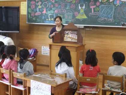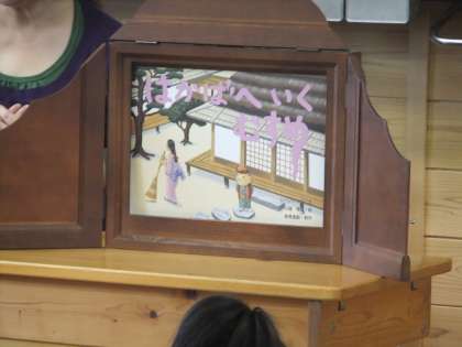 10月18日 今日のボランティア読み聞かせは,1年生がお世話になりました。紙芝居風の読み聞かせで,子ども達も興味津津。真剣にボランティアの先生の話に聞き入っていました。