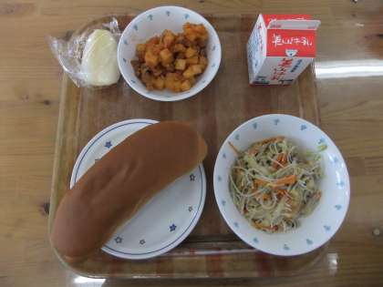 今日の献立は,ミルクコッペパン・牛乳・たっぷり野菜のビーフン・豚肉のケチャップ煮・りんごでした。豚肉のケチャップ煮は,じゃがいもと豚肉の相性がよくて,ケチャップ味でとてもおいしかったです。たっぷり野菜のビーフンは,キャベツ・たまねぎ・にんじん・しいたけ・もやしなどが入っていて,シャキシャキと歯ごたえもよくておいしかったです。