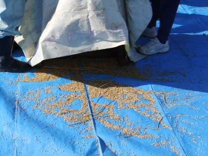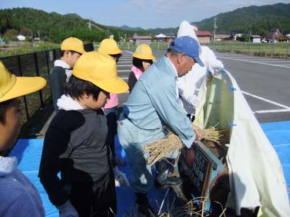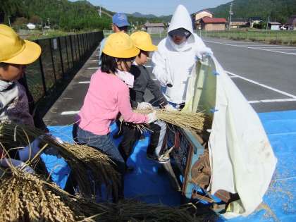 10月19日 今日の午後,学校の駐車場で,地域の方に教えていただいて。先日刈った稲を脱穀させてもらいました。昔ながらの脱穀機を使って上手に脱穀していました。