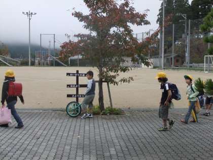 今朝の京北13度,濃霧あり。みんな元気に登校!