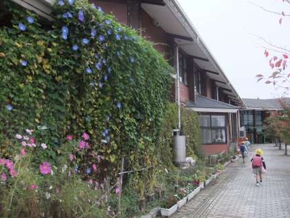 10月24日 今朝も霧が濃い朝になりました。気温は13度で,そんなに寒さは感じません。そんな中,子ども達は「あいさつの道」を元気に通って行きました。