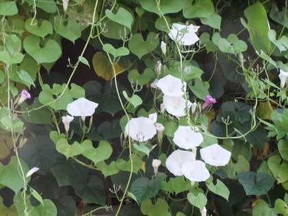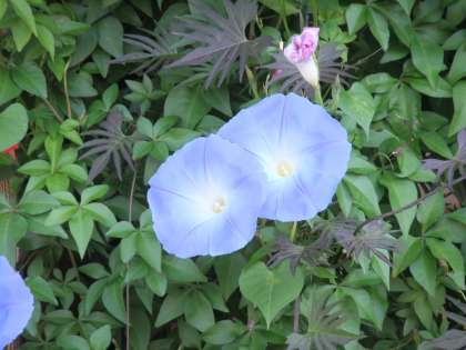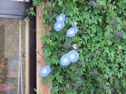 11月2日 職員室の窓を覆っているアサガオ,今日は見事な水色の大輪が咲いています。また,今週から咲き出した白いアサガオ。次から次と咲き出しています。