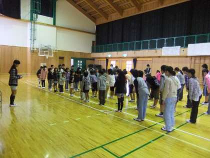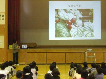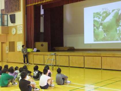 今日の朝会は、養護教諭の大中先生のお話を聞きました。今日のお話は、大中先生の家に実っている、いろんな「実」についてでした。食べられる実や、食べられない実など、いろいろな「実」のお話をエピソードも交えながらのお話でした。