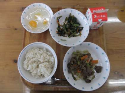 11月4日 今日の給食のメニューは,麦ご飯・牛乳・焼き肉・小松菜のごま油いため・フルーツ寒天でした。子ども達は,焼き肉とフルーツ寒天があったので喜んで食べていました。