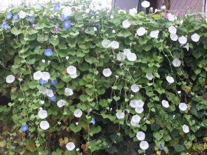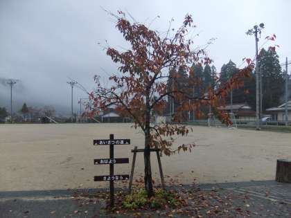11月6日 いよいよ秋も深まり,校庭も落葉・紅葉が始まっています。桜の葉は,11月末に行う焼き芋大会に集めて使います。運動場の銀杏は見事に緑の葉から黄色い葉に変身しました。その中で,緑のカーテンのアサガオは,白の昼咲くあさがおパーリーゲートが満開になっています。