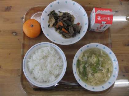 今日の献立は,ごはん・牛乳・プルコギ・レタスと卵のスープ・みかんでした。プルコギには,牛肉・人参・舞茸・たまねぎ・にらなどいろいろな具材が入っていました。子どもたちは,韓国風の焼肉をとても喜んでいただきました。レタスと卵のスープは,あっさりとしたスープでふわふわの卵とシャキシャキしたレタスがおいしかったです。