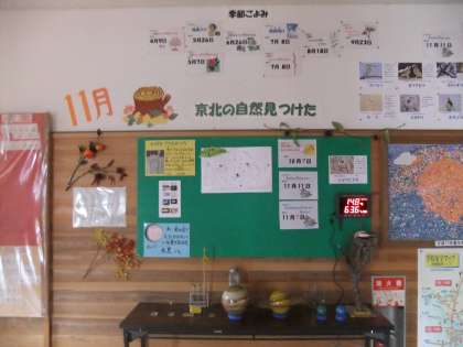 11月9日 10月から11月の暦掲示板になりました。季節を感じさせる掲示がいろいろされていて子ども達も教職員も楽しみにしています。