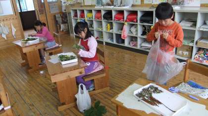 学校にもどって、画用紙で作った箱を「お弁当箱」に見立て、見つけた秋を並べて、お弁当屋さんごっこ。「できあがったら先生食べに来てね。」と、どうしたらおいしそうに見えるか工夫しながら、並べていきました。できあがった子から「お店開いた!」の合図で、「ください。」「はい、ただです。」「むしゃむしゃむしゃ、あ〜おいしかった!」と楽しいやりとりをしました。