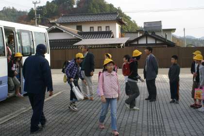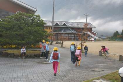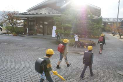 山々はすっかり秋? 寒さが身にしむ朝の登校ですが子どもたちは元気に「おはよう」と挨拶をしています。